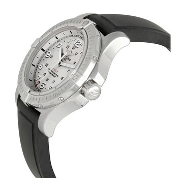 Steel case with a black rubber bracelet. Unidirectional ratcheting bezel. Silver dial with luminous hands and Arabic hour markers. Minute markers around the outer rim. Date displays at the 3 o'clock position. Superquartz movement. Scratch resistant cambered glareproofed sapphire crystal. Screw locked crown. Screwed in case back. Case diameter: 41.10. Case thickness: 13.30 mm. Tang clasp. Water resistant at 500 meters/ 1650 feet. Breitling Colt Quartz Watch A7438010-G5-132S.