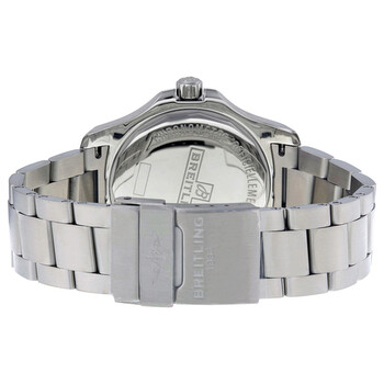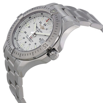 Stainless steel case with a stainless steel bracelet. Uni-directional rotating stainless steel bezel. Silver dial with luminous silver-tone hands and index hour markers. Arabic numerals mark the 6, 9 and 12 o'clock positions. 24 hour markers. Minute markers. 1/100th markers around the outer rim. Dial Type: Analog. Luminescent hands and markers. Date display at the 3 o'clock position. Breitling calibre 74 SuperQuartz movement. Scratch resistant sapphire crystal. Screw locked crown. Solid case back. Case size: 44 mm. Case thickness: 11.6 mm. Round case shape. Band width: 22 mm. Deployment clasp. Water resistant at 100 meters / 330 feet. Functions: date, hour, minute, second. Luxury watch style. Watch label: Swiss Made. Breitling Colt Silver Dial Stainless Steel Men's Watch A7438811-G792SS.