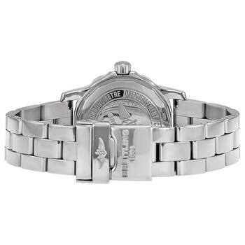 Stainless steel case with a stainless steel bracelet. Uni-directional rotating stainless steel bezel. Silver rose dial with silver-tone hands and index hour markers. Arabic numerals mark the 6, 9 and 12 o'clock positions. Minute markers around the outer rim. Dial Type: Analog. Luminescent hands and markers. Date display at the 3 o'clock position. Quartz movement. Scratch resistant sapphire crystal. Screw locked crown. Solid case back. Case diameter: 33 mm. Case thickness: 11.6 mm. Round case shape. Fold over with double safety lock clasp. Water resistant at 500 meters / 1650 feet. Functions: date, hour, minute, second. Luxury watch style. Watch label: Swiss Made. Breitling Colt Ladies Watch A7738711-G765SS.