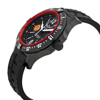 Grey stainless steel case with a black rubber strap. Uni-directional rotating grey stainless steel bezel with a red ring. Volcano black dial with luminous silver-tone hands and index hour markers. Arabic numerals appears at the 6 and 12 o'clock position. 24 hour markers. Arabic numeral minute markers (at 5 minute intervals). Minute markers around the outer rim. Dial Type: Analog. Date display at the 3 o'clock position. Breitling calibre 74 quartz movement. Scratch resistant sapphire crystal. Screw down crown. Screw down case back. Round case shape. Case size: 45 mm. Case thickness: 13.15 mm. Buckle clasp. Water resistant at 100 meters / 330 feet. Functions: date, hour, minute, second. Colt Skyracer Series. Luxury watch style. Watch label: Swiss Made. Breitling Colt Skyracer Quartz Men's Watch X74320B5/BG23 293S/X20S.1.