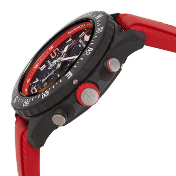 Black breitlight case with a red rubber strap. Bi-directional rotating black bezel. Black dial with silver-tone hands and index-Arabic numeral hour markers. Minute markers around the outer rim. Dial Type: Analog. Luminescent hands and markers. Date display between 4 and 5 o'clock position. Chronograph - three sub-dials displaying: 60 second, 30 minute and 1/10th of a second. Breitling Calibre 83 quartz movement. Scratch resistant sapphire crystal. Screw down crown. Solid case back. Round case shape, case size: 38 mm, case thickness: 12.1 mm. Band width: 18 mm. Tang clasp. Water resistant at 100 meters / 330 feet. Functions: chronograph, date, hour, minute, second. Endurance Series. Sport watch style. Watch label: Swiss Made. Breitling Endurance Chronograph Quartz Black Dial Unisex Watch X83310D91B2S1.