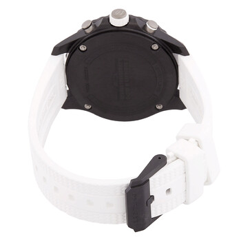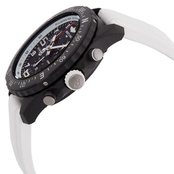 Black breitlight case with a white rubber strap. Bi-directional rotating black bezel. Black dial with silver-tone hands and index-Arabic numeral hour markers. Minute markers around the outer rim. Dial Type: Analog. Luminescent hands and markers. Date display between 4 and 5 o'clock position. Chronograph - three sub-dials displaying: 60 second, 30 minute and 1/10th of a second. Breitling Calibre 83 quartz movement. Scratch resistant sapphire crystal. Screw down crown. Solid case back. Round case shape, case size: 38 mm, case thickness: 12.1 mm. Band width: 18 mm. Tang clasp. Water resistant at 100 meters / 330 feet. Functions: chronograph, date, hour, minute, second. Endurance Series. Sport watch style. Watch label: Swiss Made. Breitling Endurance Chronograph Quartz Black Dial Unisex Watch X83310A71B1S1.