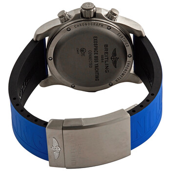 Silver-tone titanium case with a blue twin pro rubber strap. Bi-directional rotating silver-tone titanium bezel. Black carbon fiber dial with blue hands and Arabic numeral hour markers. Minute markers around the outer rim. Dial Type: Analog-digital. Luminescent hands and markers. Perpetual calendar. Breitling Calibre B55 quartz movement. Scratch resistant sapphire crystal. Pull / push crown. Solid case back. Round case shape, case size: 46 mm, case thickness: 15.25. Band width: 24 mm. Fold over with push button clasp. Water resistant at 100 meters / 330 feet. Functions: perpetual calendar, chronograph, flyback, rattrapante, alarm, year, month, date, day, GMT, second time zone, hour, minute, second, power reserve indicator, chronometer, Bluetooth. Sport watch style. Electronic, analog and 12/24hr LCD digital display, backlighting (white light), battery state-of-charge indicator. Pairing possiblity (Bluetooth Low Energy) with a smartphone (dedicated Application) for data transfer and "remote" settings. Watch label: Japan Movt. Breitling Exospace Yachting Perpetual Calander Chronograph Titanium Black Carbon Fiber Dial Men's Watch EB5512221B1S1.