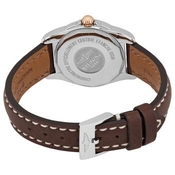 Stainless steel case with a brown leather strap. Fixed 18kt rose gold bezel. Mother of pearl dial with luminous rose gold-tone hands and diamond hour markers. Minute markers. 1/100th second markers around the outer rim. Dial Type: Analog. Luminescent hands and markers. Date display at the 3 o'clock position. Breitling calibre B72 quartz movement. Scratch resistant sapphire crystal. Pull / push crown. Solid case back. Round case shape. Case size: 29 mm. Case thickness: 8.9 mm. Band width: 14 mm. Tang clasp. Water resistant at 100 meters / 330 feet. Functions: date, hour, minute, second. Galactic 29 Series. Luxury watch style. Watch label: Swiss Made. Breitling Galactic 29 Quartz Diamond Ladies Watch C7234812-A792-484X.A12BA.1.