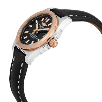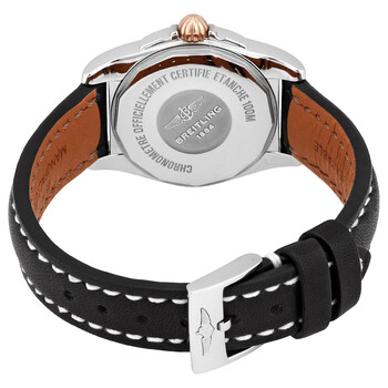 Stainless steel case with a black leather strap. Fixed 18kt rose gold bezel. Trophy black dial with luminous rose gold-tone hands and index hour markers. Minute markers. 1/100th second markers around the outer rim. Dial Type: Analog. Luminescent hands and markers. Date display at the 3 o'clock position. Breitling calibre B72 quartz movement. Scratch resistant sapphire crystal. Pull / push crown. Solid case back. Round case shape. Case size: 29 mm. Case thickness: 8.9 mm. Band width: 14 mm. Tang clasp. Water resistant at 100 meters / 330 feet. Functions: date, hour, minute, second. Galactic 29 Series. Luxury watch style. Watch label: Swiss Made. Breitling Galactic 29 Quartz Ladies Watch C7234812-BF32-477X.