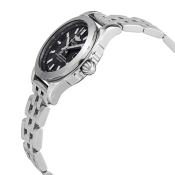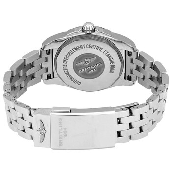 Stainless steel case with a stainless steel bracelet. Fixed grey stainless steel bezel. Trophy black dial with luminous silver-tone hands and index hour markers. Minute markers. 1/100th second markers around the outer rim. Dial Type: Analog. Luminescent hands and markers. Date display at the 3 o'clock position. Breitling calibre 72 quartz movement. Scratch resistant sapphire crystal. Pull / push crown. Solid case back. Round case shape. case size: 29 mm. Case thickness: 8.9 mm. Band width: 14 mm. Fold over clasp. Water resistant at 100 meters / 330 feet. Functions: date, hour, minute, second. Galactic 29 Series. Luxury watch style. Watch label: Swiss Made. Breitling Galactic 29 Quartz Ladies Watch W72348121B2A1.