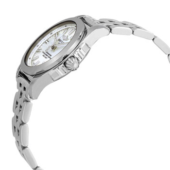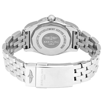 Stainless steel case with a stainless steel bracelet. Fixed stainless steel bezel. Mother of pearl dial with luminous silver-tone hands and index hour markers. Minute markers. 1/100th second markers around the outer rim. Dial Type: Analog. Luminescent hands and markers. Date display at the 3 o'clock position. Breitling calibre 72 quartz movement. Scratch resistant sapphire crystal. Pull / push crown. Solid case back. Round case shape. Case size: 29 mm. Case thickness: 8.9 mm. Band width: 14 nn. Fold over clasp. Water resistant at 100 meters / 330 feet. Functions: date, hour, minute, second. Galactic 29 Series. Luxury watch style. Watch label: Swiss Made. Breitling Galactic 29 Quartz Mother of Pearl Dial Ladies Watch W72348121A1A1.