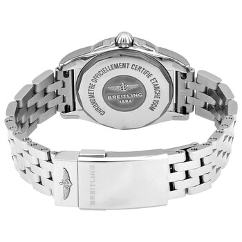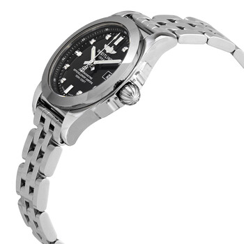 Stainless steel case with a stainless steel bracelet. Fixed stainless steel bezel. Trophy black dial with luminous silver-tone hands and diamond hour markers. Index markers at the 3, 6, 9 and 12 o'clock positions. Minute markers. 1/100th second markers around the outer rim. Dial Type: Analog. Luminescent hands. Date display at the 3 o'clock position. Breitling 72 thermocompensated SuperQuartz movement. Scratch resistant sapphire crystal. Non screw-locked - two gaskets crown. Solid case back. Round case shape. Case size: 29 mm. Case thickness: 8.9 mm. Band width: 14 mm. Fold over clasp with a push button release. Water resistant at 100 meters / 330 feet. Functions: date, hour, minute, second. Galactic 29 Sleek Series. Dress watch style. Watch label: Swiss Made. Breitling Galactic 29 Sleek Diamond Black Dial Ladies Watch W72348121B1A1.