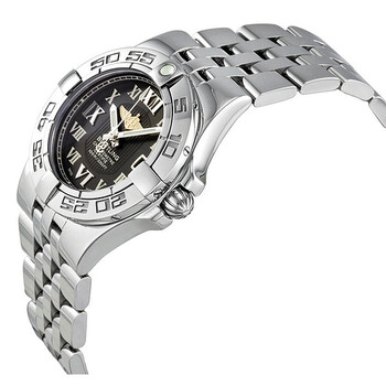 Stainless steel case with a stainless steel bracelet. Uni-directional rotating stainless steel bezel. Black dial with silver-tone hands and Roman numeral hour markers. Minute markers around the outer rim. Dial Type: Analog. Luminescent hands and markers. Date display appears at the 3 o'clock position. Quartz movement. Scratch resistant sapphire crystal. Solid case back. Case diameter: 30 mm. Case thickness: 12.2 mm. Round case shape. Fold over clasp with safety release. Water resistant at 100 meters / 330 feet. Functions: date, hour, minute, second. Luxury watch style. Watch label: Swiss Made. Breitling Galactic 30 Black Dial Stainless Steel Ladies Watch A71340L2-B950SS.