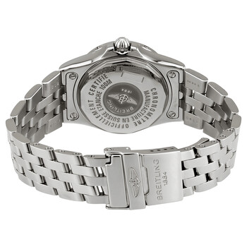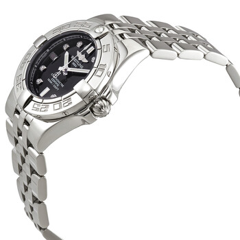 Stainless steel case with a stainless steel bracelet. Uni-directional rotating stainless steel bezel. Black dial with luminous silver-tone hands and diamond hour markers. Minute markers around the outer rim. Dial Type: Analog. Luminescent hands and markers. Date display at the 3 o'clock position. Breitling calibre 71 superquartz movement. Scratch resistant sapphire crystal. Solid case back. Case size: 30 mm. Case thickness: 12.20 mm. Round case shape. Deployment clasp. Water resistant at 100 meters / 330 feet. Functions: date, hour, minute, second. Luxury watch style. Watch label: Swiss Made. Breitling Galactic 30 Black Diamond Dial Ladies Watch A71340L2-BA14SS.