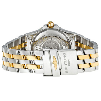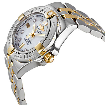 Stainless steel case with a two-tone (silver-tone and yellow gold-tone) stainless steel bracelet. Uni-directional rotating bezel. White dial with gold-tone hands and diamond hour markers. Minute markers around the outer rim. Dial Type: Analog. Luminescent hands. Date display at the 3 o'clock position. Quartz movement. Scratch resistant sapphire crystal. Non-screw locked crown. Solid case back. Case diameter: 30 mm. Case thickness: 12.1 mm. Round case shape. Fold over clasp with double safety release. Water resistant at 100 meters / 330 feet. Luxury watch style. Breitling Galactic 30 Diamond Dial Ladies Watch B71340L2-A714TT.