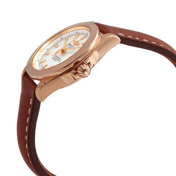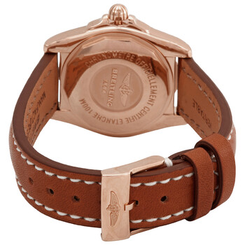 18kt rose gold case with a dark brown leather strap. Fixed bezel. White mother of pearl dial with rose gold-tone hands and index hour markers. Dial Type: Analog. Luminescent hands and markers. Date display at the 3 o'clock position. Quartz movement. Scratch resistant sapphire crystal. Pull / push crown. Round case shape, case size: 32 mm, case thickness: 10.79 mm. Band width: 16 mm. Tang clasp. Water resistant at 100 meters / 330 feet. Functions: date, hour, minute, second. Galactic 32 Series. Watch label: Swiss Made. Breitling Galactic 32 Quartz White Mother of Pearl Dial Ladies Watch H7133012/A802 406X-H14B.1.