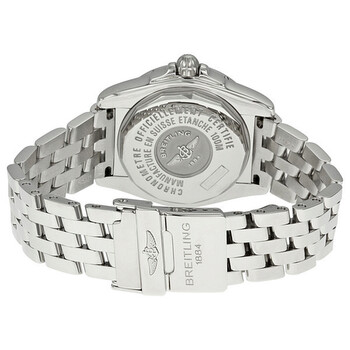 Stainless steel case with a stainless steel bracelet. Unidirectional rotating stainless steel bezel. Silver dial with luminous hands and index hour markers. Minute markers around the outer rim. Date display appears at the 3 o'clock position. Quartz movement. Scratch resistant sapphire crystal. Solid case back. Case diameter: 31.8 mm. Case thickness: 12.70 mm. Double locking fold over clasp. Water resistant at 100 meters/ 330 feet. Functions: hours, minutes, seconds, date. Breitling Galactic 32 Silver Dial Ladies Watch A71356L2-G702SS.