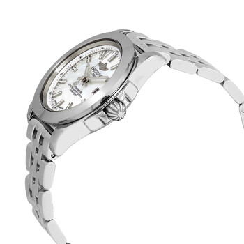 Stainless steel case with a stainless steel bracelet. Fixed grey stainless steel bezel. Mother of pearl dial with luminous silver-tone hands and index hour markers. Minute markers. 1/100th second markers around the outer rim. Dial Type: Analog. Luminescent hands and markers. Date display at the 3 o'clock position. Breitling calibre 71 quartz movement. Scratch resistant sapphire crystal. Pull / push crown. Solid case back. Round case shape. Case size: 32 mm. Case thickness: 10.79 mm. Band width: 16 mm. Fold over clasp. Water resistant at 100 meters / 330 feet. Functions: date, hour, minute, second. Galactic 32 Sleek Series. Luxury watch style. Watch label: Swiss Made. Breitling Galactic 32 Sleek Quartz Ladies Watch W71330121A2A1.