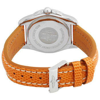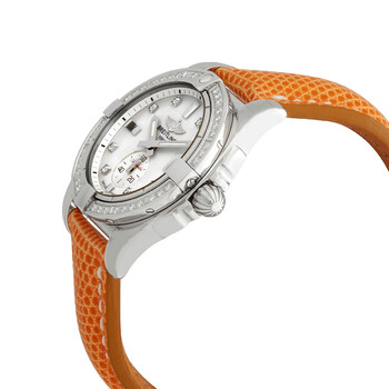 Silver-tone stainless steel case with a orange sahara leather strap. Fixed silver-tone bezel with diamond set. Mother of pearl dial with silver-tone hands and diamond hour markers. Index markers at the 6, 9 and 12 o'clock positions. Minute markers around the outer rim. Dial Type: Analog. Luminescent hands and markers. Date display at the 3 o'clock position. One subdial displaying: one- small seconds. Automatic movement. Scratch resistant sapphire crystal. Pull / push crown. Solid case back. Round case shape, case size: 36 mm. Tang clasp. Water resistant at 100 meters / 330 feet. Functions: date, hour, minute, second. Galactic 36 Series. Luxury watch style. Watch label: Swiss Made. Breitling Galactic 36 Automatic Diamond Ladies Watch A3733053/A717.118Z.A16BA.1.