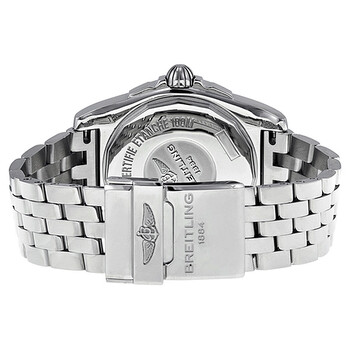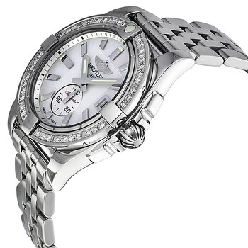 Stainless steel case with a stainless steel bracelet. Uni-directional rotating bezel set with diamonds. Mother of pearl dial with silver-tone hands and stick hour markers. Minute markers around the outer rim. Dial Type: Analog. Luminescent hands and markers. Date display appears at the 3 o'clock position. Small second sub-dial at the 6 o'clock position. Automatic movement wtih 42 hour power reserve. Scratch resistant sapphire crystal. Screw down crown. Solid case back. Case diameter: 36 mm. Case thickness: 12.3 mm. Round case shape. Band width: 18 mm. Fold over clasp with safety. Water resistant at 100 meters / 330 feet. Functions: date, hour, minute, second. Luxury watch style. Watch label: Swiss Made. Breitling Galactic 36 Automatic Diamond Mother of Pearl Dial Ladies Watch A3733053-A716SS.