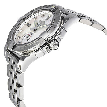 Stainless steel case with a stainless steel bracelet. Uni-directional rotating stainless steel bezel. Mother of pearl dial with silver-tone hands and diamond hour markers. Minute markers around the outer rim. Dial Type: Analog. Luminescent hands and markers. Date display appears at the 3 o'clock position. Small seconds sub-dial at the 6 o'clock position. Automatic movement. Breitling 37 engine. Scratch resistant sapphire crystal. Pull / push crown. Solid case back. Case diameter: 36 mm. Case thickness: 12.3 mm. Round case shape. Band width: 18 mm. Fold over with safety release clasp. Water resistant at 100 meters / 330 feet. Functions: date, hour, minute, second. Luxury watch style. Watch label: Swiss Made. Breitling Galactic 36 Automatic Diamond Mother of Pearl Dial Unisex Watch A3733011-A717.