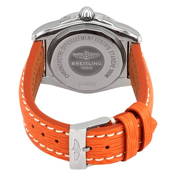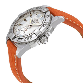 Silver-tone stainless steel case with a orange sahara leather strap. Uni-directional rotating stainless steel bezel. Mother of pearl dial with silver-tone hands and index hour markers. Minute markers around the outer rim. Dial Type: Analog. Luminescent hands and markers. Date display at the 3 o'clock position. One- small seconds subdials. Breitling Calibre 37 automatic movement with a 42-hour power reserve. Scratch resistant sapphire crystal. Round case shape, case size: 36 mm, case thickness: 12 mm. Tang clasp. Water resistant at 100 meters / 330 feet. Functions: date, hour, minute, second. Luxury watch style. Watch label: Swiss Made. Breitling Galactic 36 Automatic Orange Sahara Leather Watch A3733012/A716-112ZS.