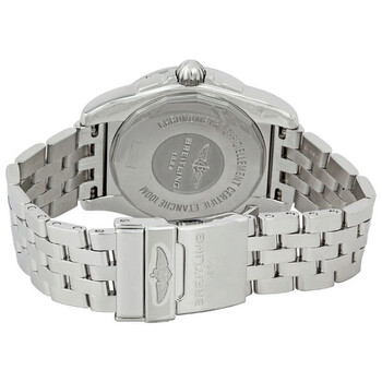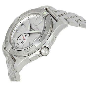 Silver-tone stainless steel case with a silver-tone stainless steel bracelet. Uni-directional ratcheted silver-tone stainless steel bezel. Silver dial with silver-tone hands and index hour markers. Minute markers around the outer rim. Dial Type: Analog. Luminescent hands and markers. Date display at the 3 o'clock position. One 60 second sub-dial subdials. Breitling Calibre 37 automatic movement with a 42-hour power reserve. Scratch resistant sapphire crystal. Screw locked with two gaskets crown. Screw in case back. Round case shape, case size: 36 mm, case thickness: 12.3 mm. Flip lock clasp. Water resistant at 100 meters / 330 feet. Functions: date, hour, minute, small second. Additional Info: 42 hour power reserve. Sport watch style. Watch label: Swiss Made. Item Variations: A3733011 G706SS, A3733011.G706SS, A3733011G706SS. Breitling Galactic 36 Automatic Silver Dial Unisex Watch A3733011-G706SS.