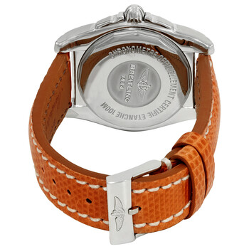 Silver-tone stainless steel case with a lizard leather strap. Fixed silver-tone stainless steel bezel. Black dial with silver-tone hands and index hour markers. Dial Type: Analog. Luminescent hands and markers. Date display at the 3 o'clock position. Breitling Calibre 74 quartz movement. Scratch resistant sapphire crystal. Pull / push crown. Round case shape, case size: 36 mm, case thickness: 11.35 mm. Band width: 18 mm. Tang clasp. Water resistant at 100 meters / 330 feet. Functions: date, hour, minute, second, chronometer. Luxury watch style. Watch label: Swiss Made. Breitling Galactic 36 Black Dial Ladies Lizard Leather Watch W7433012/BE08ORZT.