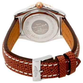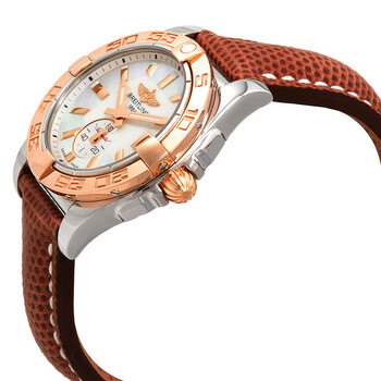Stainless steel case with a brown lizard leather strap. Uni-directional rotating 18kt rose gold bezel. Mother of pearl dial with luminous rose gold-tone hands and index hour markers. Minute markers around the outer rim. Dial Type: Analog. Luminescent hands and markers. Date display at the 3 o'clock position. Small seconds sub-dial. Breitling calibre 37 automatic movement with a 42-hour power reserve. Scratch resistant sapphire crystal. Screw down crown. Solid case back. Case size: 36 mm. Case thickness: 12.30 mm. Round case shape. Band width: 18 mm / 16 mm. Deployment clasp. Water resistant at 100 meters / 330 feet. Functions: date, hour, minute, second. Luxury watch style. Watch label: Swiss Made. Breitling Galactic 36 Mother of Pearl Dial Ladies Watch C3733012-A724WLZT.