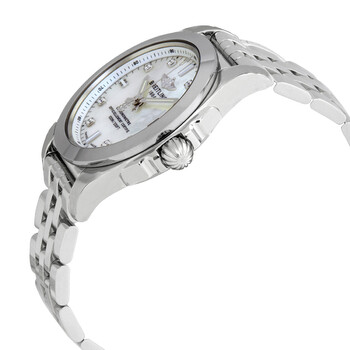 Silver-tone stainless steel case and bracelet. Tungsten carbide bezel. Mother of pearl dial with silver-tone hands and index-diamonds hour markers. Dial Type: Analog. Luminescent hands and markers. Date display at the 3 o'clock position. Breitling Calibre 74 quartz movement. Scratch resistant sapphire crystal. Solid case back. Round case shape, case size: 36 mm. Deployment clasp. Water resistant at 100 meters / 330 feet. Functions: date, hour, minute, second, chronometer. Galactic 36 Series. Watch label: Swiss Made. Breitling Galactic 36 Quartz Chronometer Diamond Ladies Watch W7433012/A780.376A.