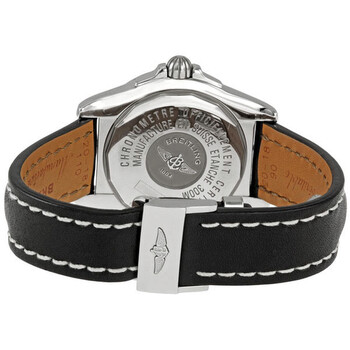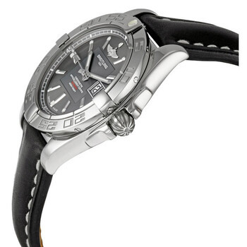 Stainless steel case with a black leather strap with contrast stiching. Unidirectional stainless steel bezel. Grey dial with luminous hands and index hour markers. Minute markers around the outer rim. Date display appears at the 3 o'clock position. Self winding mechanical movement. Scratch resistant sapphire crystal. Screw locked crown. Solid case back. Case diameter: 41 mm. Case thickness: 14 mm. Deployment clasp. Water resistant at 300 meters/ 1000 feet. Functions: hours, minutes, seconds, calendar. Breitling Galactic 41 Grey Dial Men's Watch A49350L2-F549BKLD.