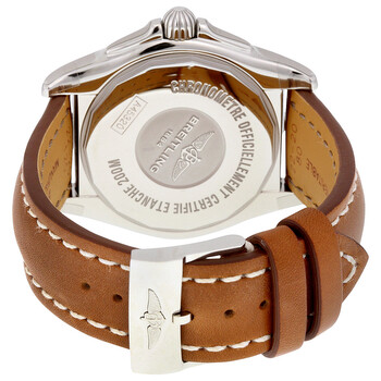 Stainless steel case with a brown leather strap. Uni-directional rotating stainless steel bezel. Silver dial with luminous silver-tone hands and index hour markers. Minute markers. 360 degree compass markings. 1/100th markers around the outer rim. Dial Type: Analog. Luminescent hands and markers. Date display at the 3 o'clock position. Day of the week display centered on the 12 o'clock position. Automatic movement with a 42 hour power reserves. Scratch resistant sapphire crystal. Screw locked crown - two gaskets. Solid case back. Case diameter: 44 mm. Case thickness: 14.3 mm. Round case shape. Band width: 22 mm / 20 mm. Tang clasp. Water resistant at 200 meters / 660 feet. Functions: date, day, hour, minute, second, compass. Luxury watch style. Watch label: Swiss Made. Breitling Galactic 44 Automatic Silver Dial Brown Leather Men's Watch A45320B9-G797CMLT.