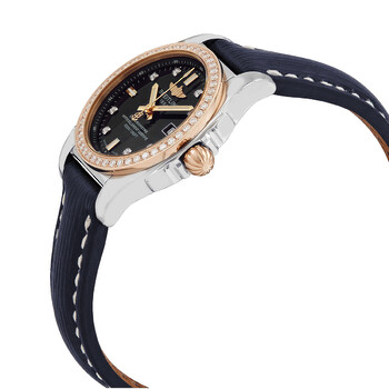 Stainless steel case with a blue leather strap. Fixed 18kt rose gold bezel set with diamonds. Black dial with luminous rose gold hands and diamond hour markers. Index markers at the 6, 9 and 12 o'clock positions. Minute markers. 1/100th second markers around the outer rim. Dial Type: Analog. Luminescent hands and markers. Date display at the 3 o'clock position. Breitling calibre 72 automatic movement. Scratch resistant sapphire crystal. Pull / push crown. Solid case back. Round case shape. Case size: 29 mm. Case thickness: 8.9 mm. Band width: 14 mm / 12 mm. Tang clasp. Water resistant at 100 meters / 330 feet. Functions: date, hour, minute, second. Galactic Series. Luxury watch style. Watch label: Swiss Made. Breitling Galactic Automatic Diamond Black Dial Ladies Watch C72348531B1X1.