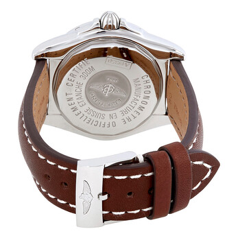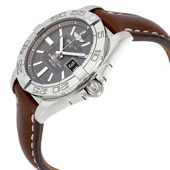 Stainless steel case with a brown leather strap. Uni-directional rotating stainless steel bezel. Grey dial with luminous silver-tone hands and index hour markers. Minute markers around the outer rim. Dial Type: Analog. Luminescent hands and markers. Date display at the 3 o'clock position. Breitling 49 automatic movement with a 42-hour power reserve. Scratch resistant sapphire crystal. Screw down crown. Solid case back. Case size: 41 mm. Case thickness: 14 mm. Round case shape. Band width: 20 mm / 18 mm. Tang clasp. Water resistant at 300 meters / 1000 feet. Functions: date, hour, minute, second. Luxury watch style. Watch label: Swiss Made. Breitling Galactic Automatic Grey Dial Men's Watch A49350L2-F549BRCT.