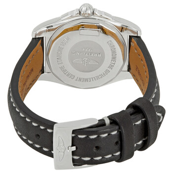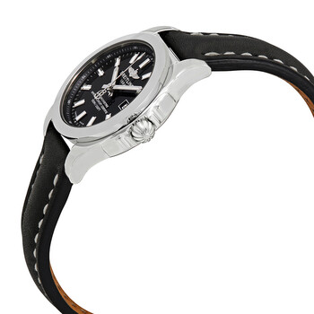 Stainless steel case with a black leather strap. Fixed stainless steel bezel. Black dial with luminous silver-tone hands and index hour markers. Minute markers. 1/100th second markers around the outer rim. Dial Type: Analog. Luminescent hands and markers. Date display at the 3 o'clock position. Quartz movement. Scratch resistant sapphire crystal. Pull / push crown. Solid case back. Round case shape. Case size: 29 mm. Case thickness: 8.9 mm. Band width: 14 mm. Tang clasp. Water resistant at 100 meters / 330 feet. Functions: date, hour, minute, second. Luxury watch style. Watch label: Swiss Made. Breitling Galactic Black Dial Ladies Watch W7234812/BE49-477X.