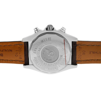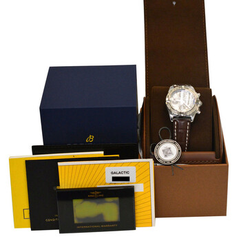 Silver-tone stainless steel case with a brown crocodile leather strap. Uni-directional rotating silver-tone stainless steel bezel. White dial with silver-tone hands and Arabic & index hour markers. Minute markers around the outer rim. Dial Type: Analog. Luminescent hands and markers. Date display at the 3 o'clock position. Chronograph - three sub-dials displaying: 60 second, 30 minute and 12 hour. Breitling Calibre 13 Automatic movement, based upon ETA Valjoux 7750, containing 25 Jewels, bitting at 28800 vph, and has a power reserve of approximately 42 hours. Scratch resistant sapphire crystal. Screw down crown. Solid case back. Round case shape, case size: 39 mm. Water resistant at 100 meters / 330 feet. Functions: chronograph, date, hour, minute, second, chronometer. Galactic Chronograph Series. Casual watch style. Watch label: Swiss Made. Breitling Galactic Chronograph Automatic Chronometer White Dial Men's Watch A13358L2/A683-725P.