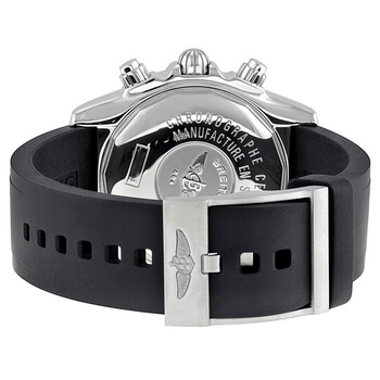 Stainless steel case with a black rubber strap. Bi-directional rotating bezel. Blue dial with silver-tone hands and stick hour markers. Minute markers. Tachymeter around the outer rim. Dial Type: Analog. Luminescent hands and markers. Date display appears at the 3 o'clock position. Chronograph - three sub-dials displaying: 60 second, 30 minute and 12 hour. Automatic movement with 42 hour power reserve. Scratch resistant sapphire crystal. Screw down crown. Solid case back. Case diameter: 44 mm. Case thickness: 16.95 mm. Round case shape. Band width: 22 mm. Tang clasp. Water resistant at 300 meters / 1000 feet. Functions: chronograph, date, hour, minute, second. Luxury watch style. Watch label: Swiss Made. Breitling Galactic Chronograph II Automatic Men's Watch A1336410-C805BKPT.