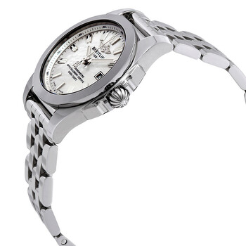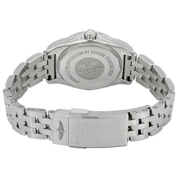 Stainless steel case with a stainless steel bracelet. Fixed stainless steel bezel. Mother of pearl dial with luminous silver-tone hands and index hour markers. Minute markers. 1/100th second markers around the outer rim. Dial Type: Analog. Luminescent hands and markers. Date display at the 3 o'clock position. Breitling calibre 72 quartz movement. Scratch resistant sapphire crystal. Screw locked crown. Solid case back. Round case shape, case size: 29 mm, case thickness: 8.90 mm. Band width: 14 mm, band length: 6 inches. Fold over clasp with a safety release. Water resistant at 100 meters / 330 feet. Functions: date, hour, minute, second. Casual watch style. Watch label: Swiss Made. Breitling Galactic Mother of Pearl Dial Ladies Watch W7234812-A784-791A.