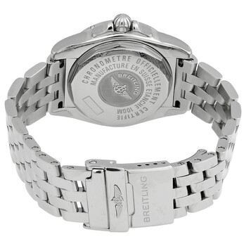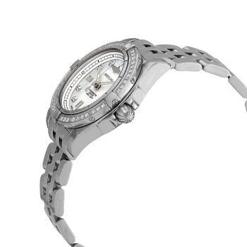 Silver-tone stainless steel case with a polished stainless steel bracelet. Uni-directional rotating silver-tone bezel with diamond set. Mother of pearl dial with silver-tone hands and diamond hour markers. Dial Type: Analog. Date display at the 3 o'clock position. Breitling Calibre 71 quartz movement. Anti-reflective scratch resistant sapphire crystal. Solid case back. Round case shape, case size: 32 mm, case thickness: 12.70 mm. Folding with safety latch clasp. Water resistant at 100 meters / 330 feet. Functions: date, hour, minute, second, chronometer. Galactic Series. Luxury watch style. Watch label: Swiss Made. Breitling Galactic Quartz Chronometer Diamond Ladies Watch A71356LA/A708.