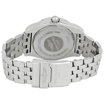 Stainless steel case with a stainless steel bracelet. Unidiectional ratcheted stainless steel bezel. Mother of Pearl dial with luminous hands and index hour markers. Minute markers around the outer rim. Luminescent hands and markers. Date display appears at the 3 o'clock position. Small seconds sub-dial at the 6 o'clock position. Self winding mechanical movement with a 42 hour power reserve. Scratch resistant sapphire crystal. Screw locked crown. Solid case back. Case diameter: 36 mm. Case thickness: 12.30 mm. Fold Over clasp with a safety release. Water resistant at 100 meters/ 330 feet. Functions: hours, minutes, small seconds, date. Breitling Galactic Stainless Steel Men's Watch A3733012-A716SS.