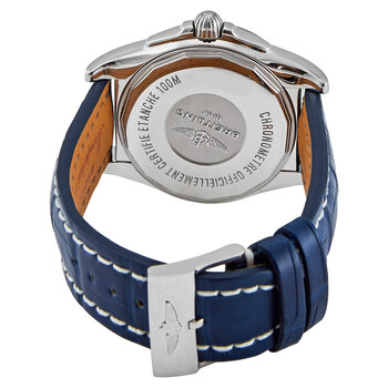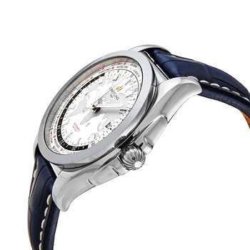 Silver-tone stainless steel case with a blue crocodile leather strap. Fixed silver-tone stainless steel bezel. Antarctica white dial with silver-tone hands and index hour markers. World markers around the outer rim. Dial Type: Analog. Luminescent hands and markers. Date display at the 3 o'clock position. Breitling Calibre 35 automatic movement with a 70-hour power reserve. Scratch resistant sapphire crystal. Screw down crown. Solid case back. Round case shape, case size: 44 mm, case thickness: 15.3 mm. Band width: 22 mm. Tang clasp. Water resistant at 100 meters / 330 feet. Functions: date, hour, minute, second, GMT, world time. Luxury watch style. Watch label: Swiss Made. Item Variations: WB3510U0/A777-731P. Breitling Galactic Unitime Antarctica White Dial Blue leather Men's Watch WB3510U0-A777BLCT.