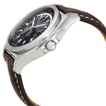 Stainless steel case with a dark brown crocodile leather strap. Fixed bezel. Black dial with silver-tone hands and index hour markers. Dial Type: Analog. Luminescent hands and markers. Date display at the 3 o'clock position. Automatic movement. Breitling caliber b35 engine. Scratch resistant sapphire crystal. Screw down crown. Solid case back. Case diameter: 44 mm. Case thickness: 15.30 mm. Round case shape. Tang clasp. Water resistant at 100 meters / 330 feet. Functions: date, hour, minute, second. Luxury watch style. Watch label: Swiss Made. Item Variations: WB3510U4/BD94-739P. Breitling Galactic Unitime Black Dial Dark Brown Crocodile Leather Men's Watch WB3510U4-BD94DBRCT.