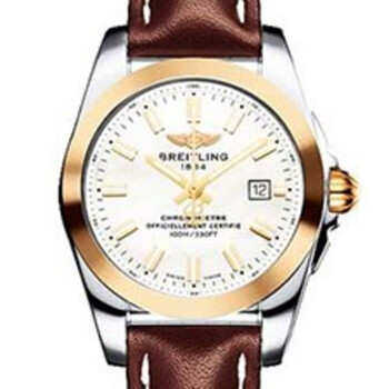 Silver-tone stainless steel case with a white rubber strap. Fixed rose gold-tone 18kt rose gold bezel. Mother of pearl dial with rose gold-tone hands and diamond hour markers. Minute markers around the outer rim. Dial Type: Analog. Luminescent hands and markers. Date display at the 3 o'clock position. Breitling Calibre 72 quartz movement. Scratch resistant sapphire crystal. Solid case back. Round case shape, case size: 29 mm, case thickness: 8.9 mm. Deployment with push button release clasp. Water resistant at 100 meters / 330 feet. Functions: date, hour, minute, second. Sport watch style. Watch label: Swiss Made. Breitling Galatic 29 Sleek Quartz Diamond Ladies Watch C7234812/A792-249S.