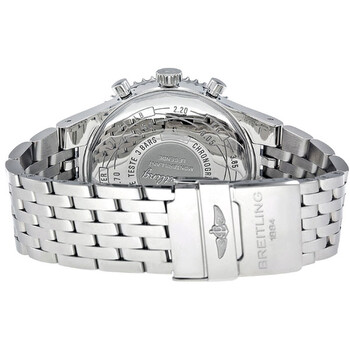 Silver-tone stainless steel case with a silver-tone stainless steel bracelet. Bi-directional rotating slide rule black ion-plated stainless steel bezel. White dial with silver-tone hands and index hour markers. Minute markers. mile / kilometer conversion around the outer rim. Dial Type: Analog. Luminescent hands and markers. Date display between 4 and 5 o'clock position. Chronograph - four sub-dials displaying: 1/100th scale, 60 second, 30 minute and 12 hour. Breitling Calibre 23 Automatic movement, based upon ETA 7753, containing 27 Jewels, bitting at 28800 vph, and has a power reserve of approximately 42 hours. Scratch resistant sapphire crystal. Pull / push crown. Solid case back. Round case shape, case size: 47 mm, case thickness: 15 mm. Band width: 24 mm. Fold over with safety release clasp. Water resistant at 30 meters / 100 feet. Functions: chronograph, date, hour, minute, second, chronometer. Additional Info: limited edition - 2000 pieces. Montbrilliant Series. Luxury watch style. Watch label: Swiss Made. Item Variations: A23351A6 G741SS, A23351A6.G741SS, A23351A6G741SS. Breitling Montbrillant 47 Chronograph White Dial Men's Watch A23351A6-G741SS.
