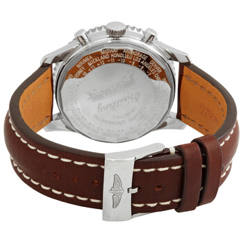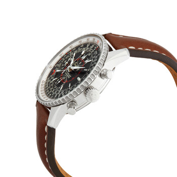 Silver-tone polished stainless steel case with a brown leather strap. Bi-directional rotating bezel. Black dial with silver-tone hands and index hour markers. Dial Type: Analog. Luminescent hands and markers. Automatic movement. Scratch resistant sapphire crystal. Round case shape, case size: 43 mm, case thickness: 14.1 mm. Band width: 24 mm. Tang clasp. Water resistant at 30 meters / 100 feet. Functions: GMT, second time zone, hour, minute, second, slide rule feature, day of the week, date, month, chronograph. Montbrillant Datora Series. Luxury watch style. Watch label: Swiss Made. Breitling Montbrillant Datora Chronograph Automatic Black Dial Men's Watch A2133012/B571.