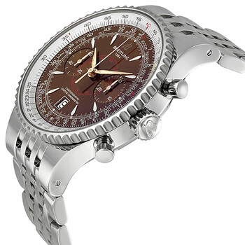 Stainless steel case with a stainless steel bracelet. Bi-directional rotating stainless steel bezel. Bronze dial with rose gold-tone hands and stick hour markers. Minute markers. Mile / kilometer conversion scale around the outer rim. Dial Type: Analog. Luminescent hands and markers. Date display appears at the 6 o'clock position. Chronograph - two sub-dials displaying: 30 minute and 1/4th of a second. Automatic movement with 42 hour power reserve. Scratch resistant sapphire crystal. Pull / push crown. Solid case back. Case diameter: 47 mm. Case thickness: 15 mm. Round case shape. Fold over clasp with safety. Water resistant at 30 meters / 100 feet. Functions: chronograph, date, hour, minute, second. Luxury watch style. Breitling Montbrillant Legende Automatic Chronograph Men's Watch A2334021-Q548SS.
