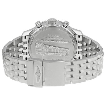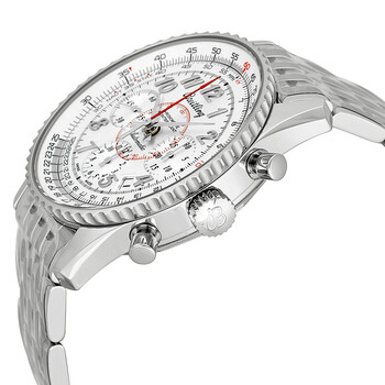 Stainless steel case with a stainless steel bracelet. Bi-directional rotating bezel with slide rule. Silver dial with silver-tone hands and Arabic numeral hour markers. Minute markers. Navigation computer markings around the outer rim. Dial Type: Analog. Luminescent hands and markers. Date display between 4 and 5 o'clock position. Chronograph - four sub-dials displaying: 1/4th of a second, large 60 second, 30 minute and 12 hour. Automatic movement with 70 hour power reserve. Scratch resistant sapphire crystal. Pull / push crown - two gaskets. Screw down case back. Case diameter: 40 mm. Case thickness: 13.50 mm. Round case shape. Deployment clasp. Water resistant at 30 meters / 100 feet. Functions: chronograph, date, hour, minute, second, slide rule. Luxury watch style. Watch label: Swiss Made. Other Information: "Slide Rule" aka "Navigation Computer". The slide-rule allows to compute different airborne calculations such as fuel consumption, climbing times & converting miles into nautical miles or kilometers.Breitling Montbrilliant 01 Automatic Chronograph Men's Watch AB013012/G735.