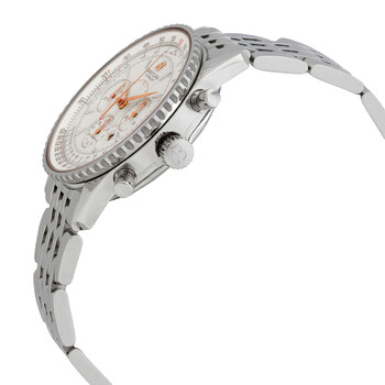 Silver-tone stainless steel case and bracelet. Bi-directional rotating slide rule silver-tone stainless steel bezel. Silver dial with silver tone hands and silver tone stick hour markers. Slide rule markers around the outer rim. Dial Type: Analog. Date display between 4 and 5 o'clock position. Chronograph - two sub-dials displaying: 60 second and 30 minute. Breitling Calibre 41 Automatic movement, based upon ETA 2892-A2, containing 38 Jewels, bitting at 28800 vph, and has a power reserve of approximately 42 hours. Scratch resistant mineral crystal. Round case shape, case size: 38 mm, case thickness: 13 mm. Band width: 20-18 mm, band length: 8.5 inches. Deployment clasp. Water resistant at 30 meters / 100 feet. Functions: chronograph, date, hour, minute, second, nautical miles conversion scale. Additional Info: chronograph, date display between 4 and 5 o'clock. Montbrilliant Series. Sport watch style. Item Variations: A4137012. Breitling Montbrilliant Chronograph Automatic Silver Dial Men's Watch A4137012-G634-444A.