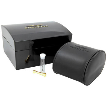 Silver-tone stainless steel case with a black leather deployant closure strap. Bi-directional rotating slide rule silver-tone stainless steel bezel. Black dial with silver-tone hands and index hour markers. Date scale with pointer. mile / kilometer conversion scale. Dial Type: Analog. Luminescent hands and markers. Day of the week and month at the 12 o'clock position. Chronograph - three sub-dials displaying: 24 hour/60 second, 30 minute and 12 hour. Breitling Calibre 21 Automatic movement, based upon ETA 7751 Valjoux, containing 25 Jewels, bitting at 28800 vph, and has a power reserve of approximately 42 hours. Scratch resistant sapphire crystal. Non screw locked with two gaskets crown. Screw in case back. Round case shape, case size: 43 mm, case thickness: 14.1 mm. Band width: 24 mm. Deployment clasp. Water resistant at 30 meters / 100 feet. Functions: month, day, date, hours, minutes, seconds, chronograph, GMT, second time zone, world time, navigation computerr. Montbrilliant Series. Travel watch style. Item Variations: A2133012-B5-436X. Breitling MontBrilliant Datora Men's Watch A2133012-B571BKLD.