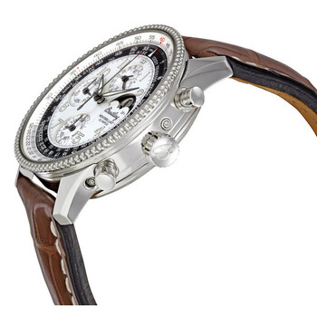 Silver-tone stainless steel case with a brown crocodile leather strap. Bi-directional rotating slide rule silver-tone stainless steel bezel. Silver dial with luminous hands and Arabic hour markers. Tachymeter scale appears around the outer rim. Dial Type: Analog. Luminescent hands and markers. Leap-year calendar. Four sub-dials displaying: 60 second / date, 30 minute / month, 12 hour / day of the week and moonphase. Breitling Calibre 19 Automatic movement, based upon ETA 2892-A2, containing 38 Jewels, bitting at 28800 vph, and has a power reserve of approximately 42 hours. Scratch resistant sapphire crystal. Solid case back. Round case shape, case size: 43 mm, case thickness: 15.4 mm. Band width: 22 mm. Tang clasp. Water resistant at 50 meters / 165 feet. Functions: chronograph, moonpase, month, date, day, hour, minute, second, chronometer. Montbrilliant Olympus Series. Sport watch style. Watch label: Swiss Made. Breitling Montbrilliant Olympus Silver Dial Chronograph Automatic Men's Watch A1935012-G592BRCT.