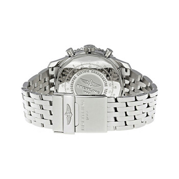 Stainless steel case with a stainless steel bracelet. Bidirectional stainless steel bezel. Black dial with luminous hands and Arabic numeral hour markers. Minute markers. Miles / kilometer conversion scale. Tachymeter around the outer rim. Dial Type: Analog. Luminescent hands. Date display appears between the 4 and 5 o'clock positions. Chronograph - three white sub-dials displaying: 12 hours, 30 minutes and 60 seconds. Automatic movement with a 70 hour power reserve. Scratch resistant sapphire crystal. Non screw-locked crown - two gaskets. Solid case back. Case diameter: 43.7 mm. Deployment clasp. Water resistant at 30 meters/ 100 feet. Functions: hours, minutes, seconds, date, chronograph, tachymeter. Sport watch style. Watch label: Swiss Made. Breitling Navitimer 01 Black Dial Stainless Steel Men's Watch AB012012-BB02SS.