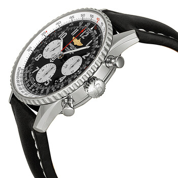 Stainless steel case with a black leather strap. Bi-directional rotating stainless steel bezel. Black dial with silver-tone hands and Arabic numeral hour markers. Minute markers. slide rule markings around the outer rim. Dial Type: Analog. Luminescent hands and markers. Date display between 4 and 5 o'clock positions. Chronograph - three sub-dials displaying: 60 second, 30 minute and 12 hour. Self winding mechanical movement. Breitling 01 engine. Scratch resistant sapphire crystal. Pull / push - two gaskets crown. Solid case back. Case diameter: 42 mm. Case thickness: 14.25 mm. Round case shape. Band width: 20 mm / 22 mm. Tang clasp. Water resistant at 30 meters / 100 feet. Functions: chronograph, date, hour, minute, second. Additional Info: additional info: fitted with the "slide rule" aka "navigation computer" which allows to compute different airborne calculations such as fuel consumpt. Luxury watch style. Watch label: Swiss Made. Breitling Navitimer 01 Chronograph Automatic Black Dial Black Leather Men's Watch AB012012-BB02BKLT.