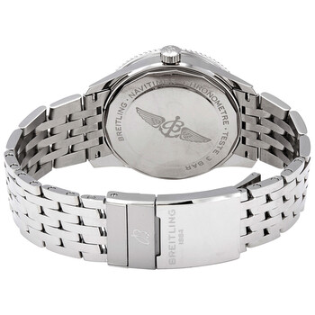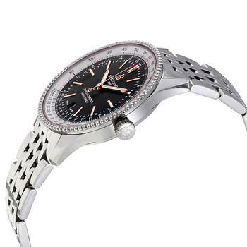 Stainless steel case with a stainless steel bracelet. Uni-directional rotating stainless steel bezel. Black dial with luminous rose gold-tone hands and index hour markers. Minute markers. Tachymeter markers around the outer rim. Dial Type: Analog. Luminescent hands and markers. Date display at the 6 o'clock position. Breitling calibre 17 automatic movement, based upon ETA 2824-2, containing 25 Jewels, bitting at 28800 vph, and has a power reserve of approximately 42 hours. Scratch resistant sapphire crystal. Pull / push crown. Solid case back. Round case shape. Case size: 41 mm. Case thickness: 10.1 mm. Band width: 22 mm. Fold over clasp with a safety release. Water resistant at 30 meters / 100 feet. Functions: date, hour, minute, second, chronometer. Luxury watch style. Watch label: Swiss Made. Breitling Navitimer 1 Automatic Black Dial 41 mm Men's Watch A17326211B1A1.