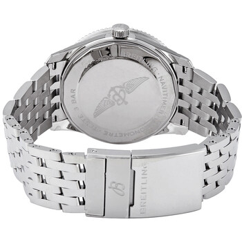 Silver-tone stainless steel case and bracelet. Uni-directional rotating silver-tone stainless steel bezel. Silver dial with luminous rose gold-tone hands and index hour markers. Minute markers. Tachymeter markings around the outer rim. Dial Type: Analog. Luminescent hands and markers. Date display at the 6 o'clock position. Breitling Calibre 17 Automatic movement, based upon ETA 2824-2, containing 25 Jewels, bitting at 28800 vph, and has a power reserve of approximately 42 hours. Scratch resistant sapphire crystal. Pull / push crown. Solid case back. Round case shape, case size: 41 mm, case thickness: 10.1 mm. Band width: 22 mm. Deployment with push button release clasp. Water resistant at 30 meters / 100 feet. Functions: date, hour, minute, second, chronometer. Navitimer 1 Series. Luxury watch style. Watch label: Swiss Made. Breitling Navitimer 1 Automatic Silver Dial Men's Watch A17326211G1A1.
